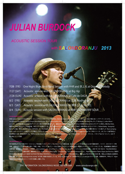 一昨年に続きロンドンからJulian Burdockさんを迎えてのライブツアーを行います。母国で自己の率いるバンド『24PESOS』の楽曲やBlues standardをこちら日本のミュージシャンとの共演で演奏します。今回は例年数回だけ行っていたSALONDORANJUとのAcoustic duoをメインとしたツアーとなりますが、初日のみ『One night blues rock band session』と銘打ち、-Hyoer Hybrid Rock Band-"HHR"とこのツアーでは例年ドラムを歴任している世上光さんを迎えたロック・セッション・パーティーを行います。UKの大御所R&B、Soul、Blues界で活躍する彼の最高にグルーヴィーなプレイをぜひお楽しみに!英国音楽ファン&南部系Bluesファン大必見!!!